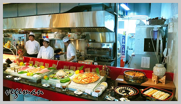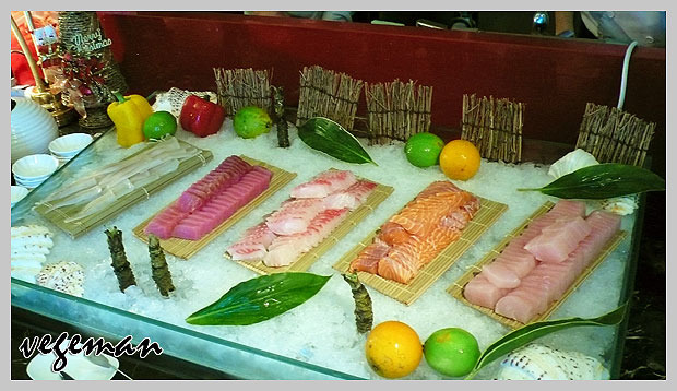 整體食物陳列整齊清潔,果然是新開的飯店,還算生鮮的生魚片我後來吃了好幾片~花樣剛剛好!